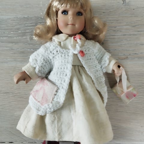 Denne dukke er klædt i en historisk inspireret dragt med rige tekstiler i rød og guld, udsmykket med perler og fine detaljer. Dukken har en hvid underkjole og sko med perleudsmykning. Den er lavet med fokus på detaljer i både tøj og ansigt, og kan bruges som samlerobjekt eller pynt.