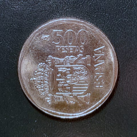 100 Pesetas 1998 - 2000 Juan Carlos I (value as "100", with dots around the rim) Aluminium-bronze • 9.3 g • ø 24.5 mm, KM#989