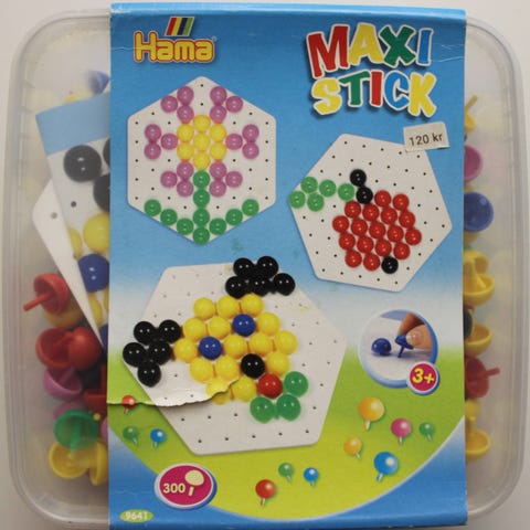 Hama børnelegetøj bestående af perler opbevaret i to metalæsker med låg. Den ene æske har juletræsmotiv, den anden er rød. Inkluderer perler i forskellige farver og små plader til at arrangere perlerne på.