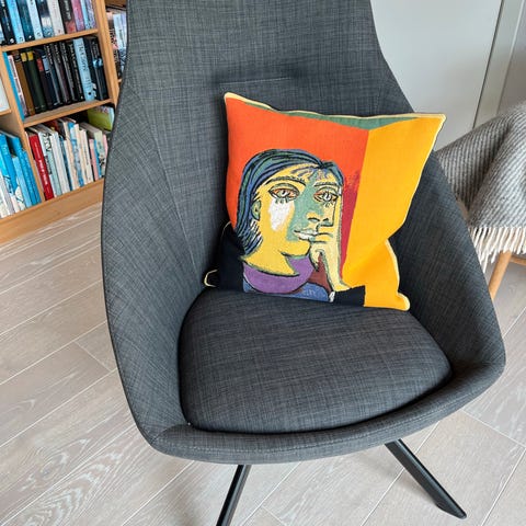 Stor og komfortabel lænestol i lyst, gråt stof med tilhørende puf. Få brugsspor i stof, ingen pletter. Tidl. renset. Det er en ægte "flyder", og man kan godt sidder voksen og barn sammen i den. Sælges udelukkende pga pladsmangel. Ikke-ryger hjem, men hund i hjem. Nypris ca 6000