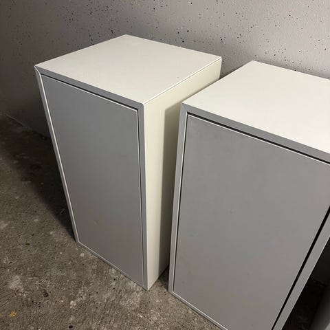 Ikea Eket skænk/reol bestående af to moduler med tre skuffer hver, som er skruet sammen og sat på kraftige møbelhjul med bremse.