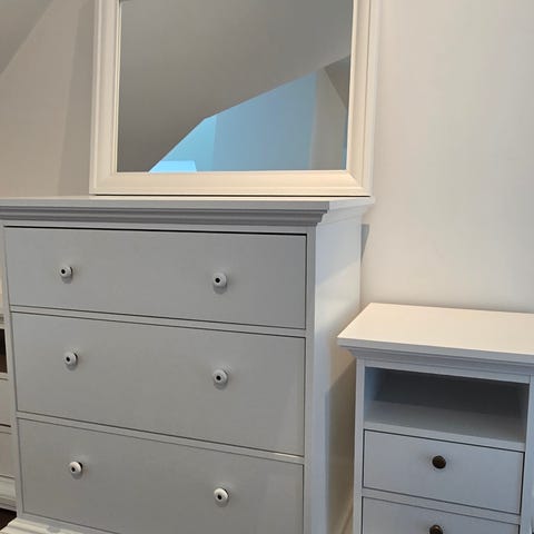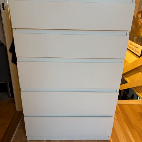 Kommode med 6 skuffer - den ene skuffe uden bund, derfor pris kun 150 kr. Står på 1. Sal . Du skal selv bære ned