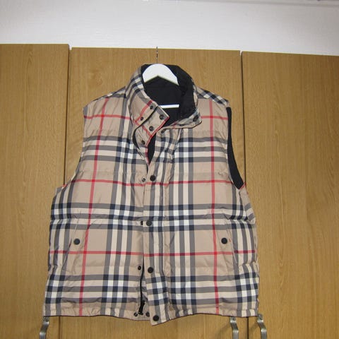 Burberry vest i den klassiske Burberrytern, vendbar. Indbygget hætte i kraven. Størrelse XXL. Vesten er designet til mænd og har et klassisk ternet mønster på forsiden med en ensfarvet bagside. Materialet er bomuld, hvilket gør den velegnet til udendørs brug som et let lag.