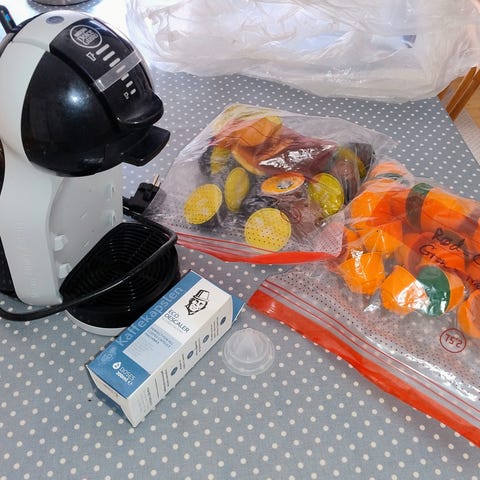 Kaffemaskine til kapsler. Med i pris er 17 div. kapsler. Maskine i lys grå. Velfungerende.