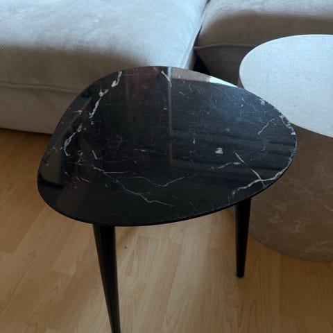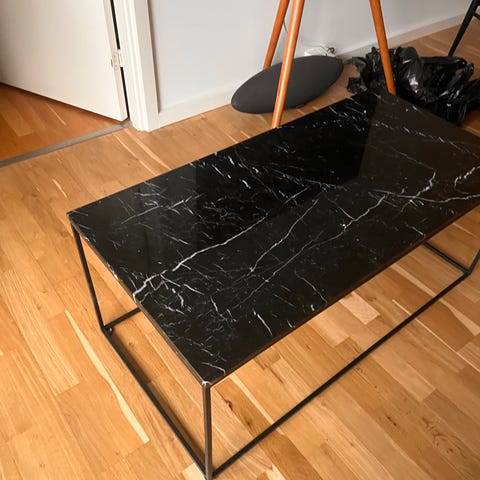 Stilrent og tidløst sofabord/sidebord med massiv sort marmorplade og slankt sort metalstel. Bordet har et eksklusivt og roligt udtryk, som passer ind i både moderne og klassiske indretninger.