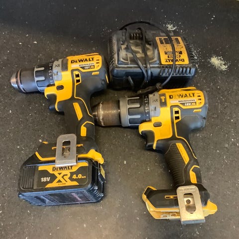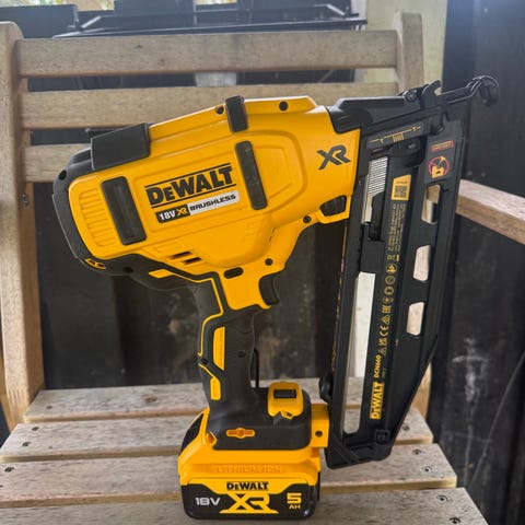 DeWalt XR 18V sømpistol med medfølgende batteri og lader. Værktøjet er designet til at arbejde med søm og har et ergonomisk håndtag for bedre greb og kontrol. I god stand. Fungere som det skal.