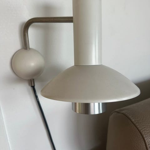Louis Poulsen PH lampe designet af Poul Henningsen. Lampen har en rund, hvid skærm og vægmontering. Modellen er mærket med type 133057 og har et klassisk, funktionelt design.