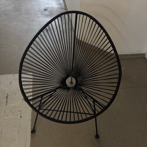 Acapulco stol med sort metalstel og sorte plastiktråde. Stolen har et rundt sæde med åbent design og ben i metal. Velegnet til indendørs brug.
