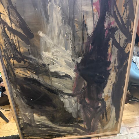 Abstrakt maleri i træramme med dominerende farver i sort, grå og brune nuancer. Maleriet har en tekstureret overflade og viser et ekspressionistisk motiv. Rammen er lavet af træ og maleriet er egnet til vægophæng.
