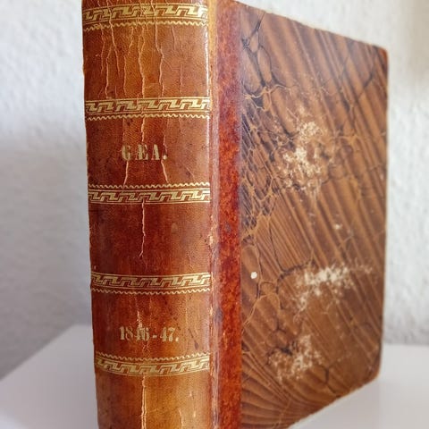 Røde, nogenlunde samtidige halvlæderbind. Guldtitel og -dekoration på ryg. Marmoreret overtrækspapir og snit. Lette brugsspor, ellers pæne. Ryggene let solet. Ejernavn med pen på friblad i begge bind. H. I. Bing og Søns forlag 1844 & 1845.