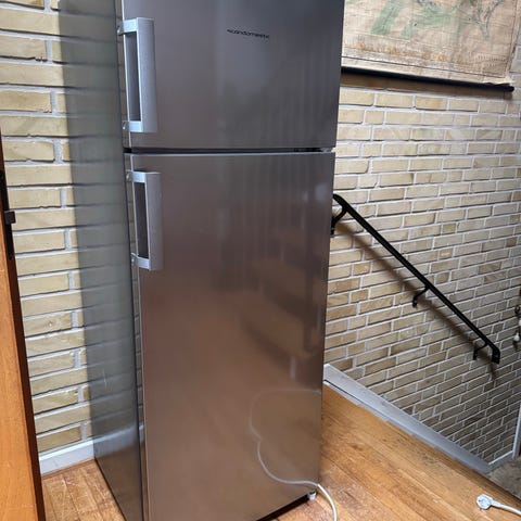 Scandomestic køle-fryseskab med kombineret køle- og frysefunktion. Produktet har et enkelt design og er velegnet til opbevaring af madvarer ved forskellige temperaturer. Køle-fryseskabet har separate rum til køling og frysning, herunder skuffer i frysedelen og hylder i køledelen.