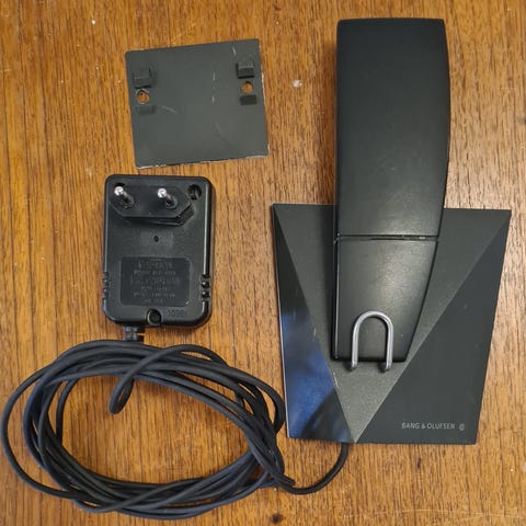 Bang & Olufsen BeoCom 6000 telefon blå med trådløs håndsæt og baseenhed. Telefonen har et numerisk tastatur, flere funktionsknapper og en lille display-skærm. Farven er grå med sort base, og den leveres med tilhørende kabler og strømforsyning.