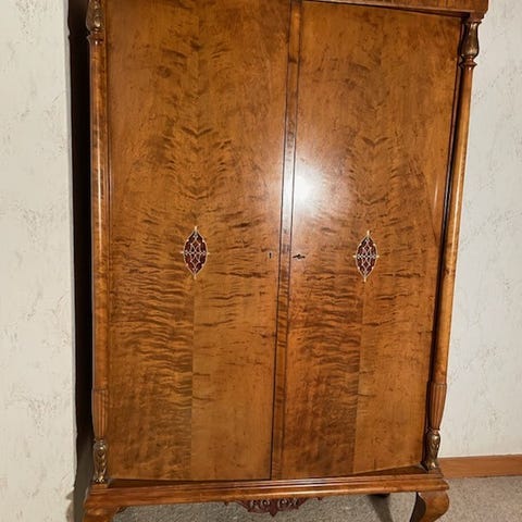 Antikt udskåret træskab, vi kalder det løveskabet, med detaljeret dekorativt mønster og løvehovedbeslag i metal. Skabet har en dør med udskæringer og en åben hylde nederst. Passer til opbevaring og dekorativ brug i hjemmet. Størrelse HxBxD 170x65x55. Pris idé 1.500,- men kom med et bud!