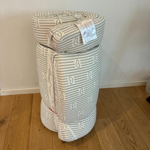 Baby senge-madras med 2 dyner og uåbnet senge lined samt top madras.