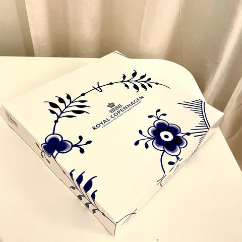 Royal Copenhagen blå mega riflet lav skål (også kendt som moderne tallerken) med en diameter på 20 cm sælges. Skålen er helt ny og har aldrig været i brug.