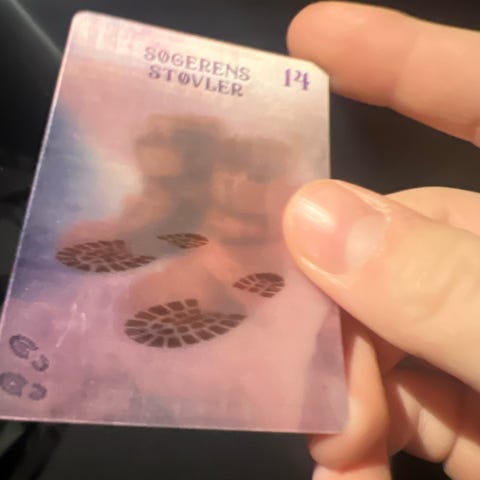 Søgerens Støvler kortspil bestående af spillekort med motiv af støvler og fodspor. Kortene er små og bærbare, velegnet til spil og samling.