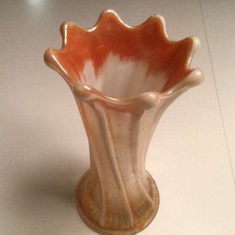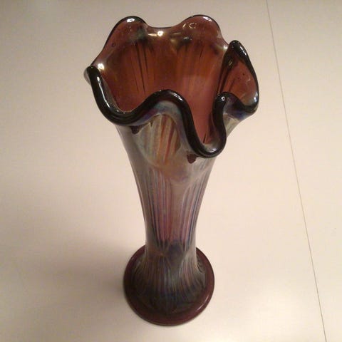 En lille gammel lustre glas vase, i klar glas base, m/ rødlig , grøn, lilla changering, højde 16 cm , Søgeord ! Samler, pynt, dekoration, samleobjekt, indbo, indretning, blomster, SENDER GERNE MED DAO ELLER AFHENTNING.