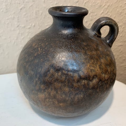 FLOT West Germany vase fra Ruscha art Keramik. Fin "buttet" form med flotrund hank, kort hals og bred åbning. FLOT Ruscha typisk lavaglasur i fine hvide, grå, brune, beige, sorte og rødbrune nuancer. TOP retro,,,,,!! Vasen er uden skader eller skår.