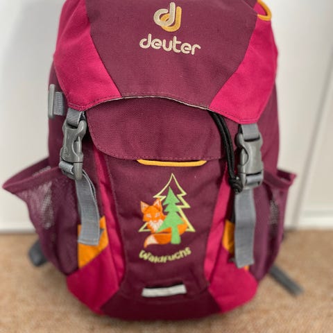 Deuter Waldfuchs børne rygsæk med justerbare skulderstropper, flere lommer og farver i blå, grøn og beige. Designet til børn 5-8 år, egnet til udendørs brug og skov- og skoleture. Der følger regnslag med, bygget til tasken.