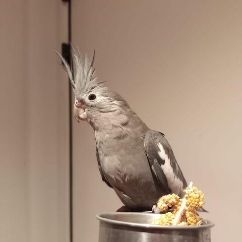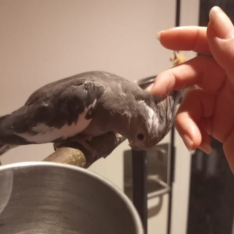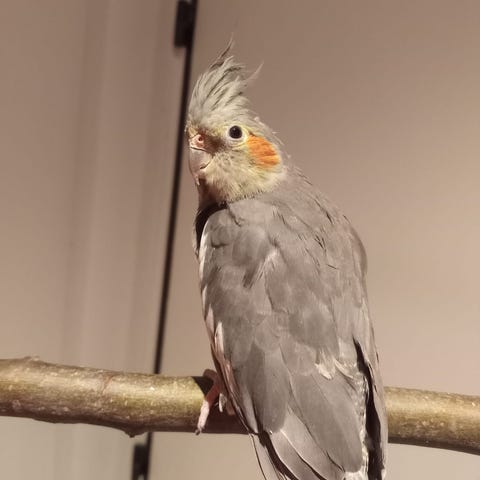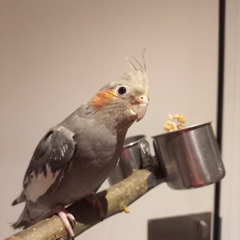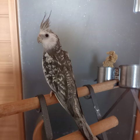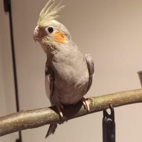 Fin og rolig nymfeparakitunge. Rolig og tam fugl, kontaktsøgende, kan kløes i nakken.