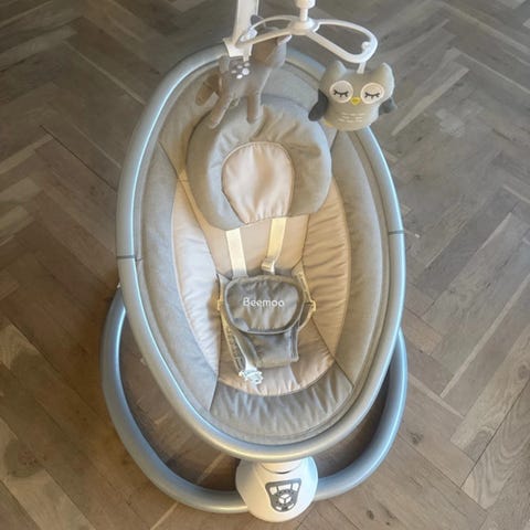 Beemo baby rocker i grå farve. Stolen er designet til børn og har en blød polstring for komfort. Udstyret med sikkerhedssele for ekstra tryghed.