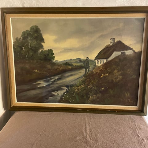 Oljemaleri af et landskab med en sti, hegn og træer. Maleriet viser en naturlig scene med himmel og skyer, græs og buske langs stien. Farverne domineres af grønne, brune og blå nuancer.