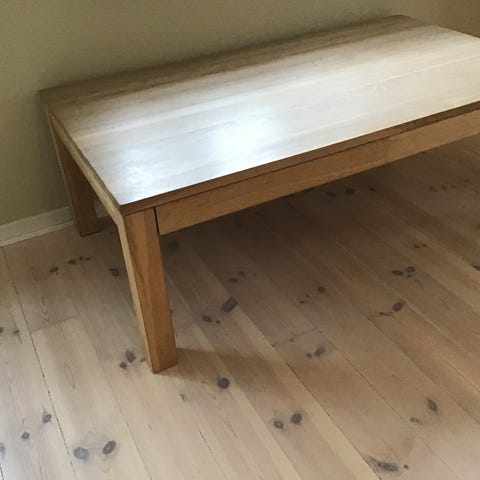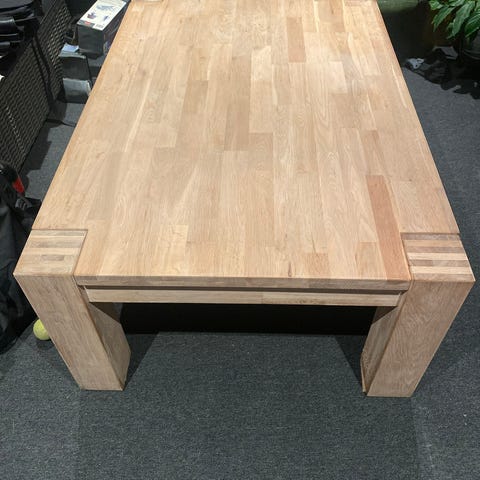 Sæbebehandlet egetræsbord med gennemgående skuffe