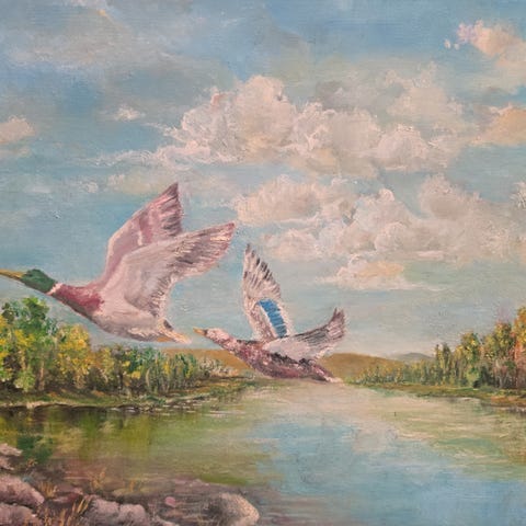 Maleri med motiv af fugle i landskab