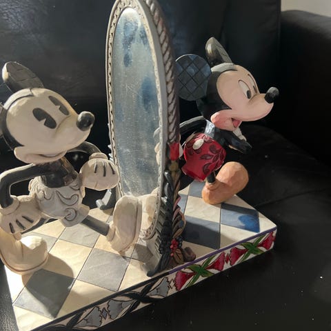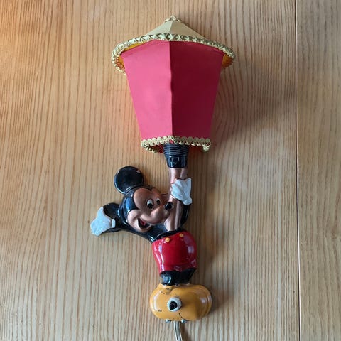 Mickey Mouse, der sidder i et fly. Samleobjekt / Legetøjet kan hænges op i snor. Fremstillet af "træ?" med farverig maling.
