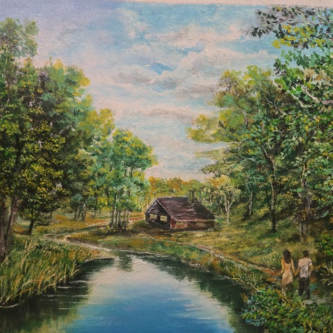 Olie maleri, der forestiller et landskab med en flod, træer og bjerge i baggrunden. Maleriet viser detaljerede naturmotiver med blå himmel og skyer samt fugle i luften. Farvepaletten inkluderer grønne, blå og jordfarver.