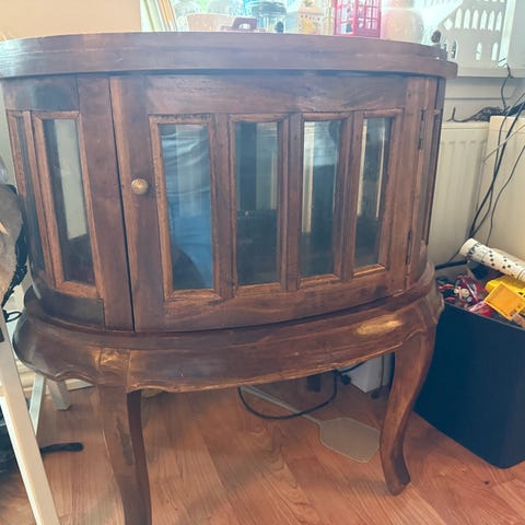 Super fint og stemningsfyldt barskab (h 102, b 61 d 26 cm) med lys som giver den mest fantastiske farverige effekt. Genial til stue eller køkken i sommerhus eller hjemme. Gedigent dansk snedkerhåndværk fra 1950’erne. Brug det som barskab, køkkenskab eller som opbevaring i den mørke entré eller måske til makeup og smykker i soveværelset? Virkelig fint og i flot stand. Hylderne inden i kan flyttes efter behov eller helt tages ud. Kan aflåses og nøgle medfølger selvfølgelig. Kan stå på gulvet eller hænge på væggen (der er flotte indbyggede ophæng). Kan leveres