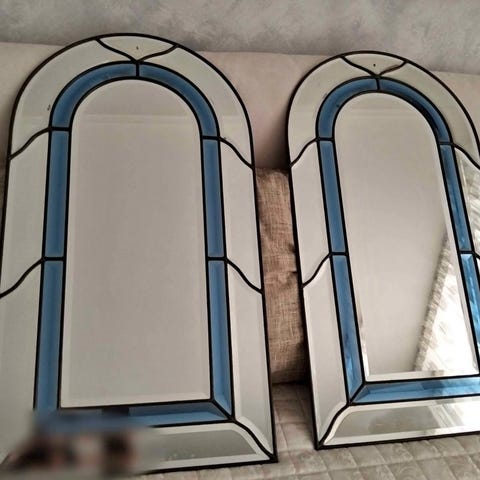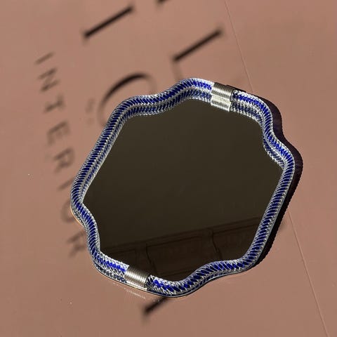 Elegant og karakterfuldt vintage spejl med smuk blå glasfascia og fine moleringer, indrammet i messing. Et ægte statement-piece med tydelig reference til italiensk design fra 1970’erne – både dekorativt og tidløst.