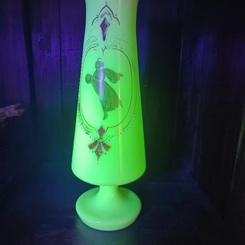 Lille fin glasskål i Uranglas på 3 ben. Højde 7 cm, diameter 9 cm.