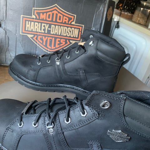 Harley-Davidson støvler i størrelse 43. Støvlerne er fremstillet af læder og har en robust sål med slidstærke elementer. Designet til at give god støtte og beskyttelse, velegnet til motorcykelkørsel og udendørs brug.