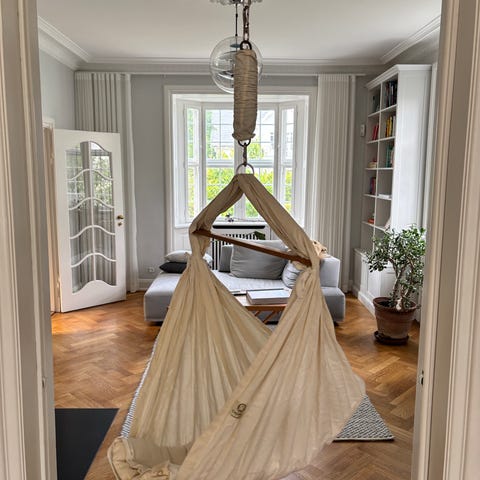Det er den originale slyngevugge, før det kom flere på markedet. Alt er åndbart, og der er plads til store og små babyer, de ligger godt og stabilt, også selvom de vil kravle rundt. Det er en kæmpe hjælp til at skabe ro til børn, der har svært ved at falde i søvn, blive i søvn, eller bare få ro.