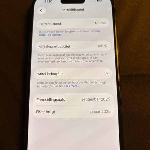 Apple iPhone 15 smartphone med 128 GB lagerplads. Enheden har en sort farve og leveres i original emballage. Batteristatus viser maksimal kapacitet på 100%, hvilket indikerer en ny eller næsten ny batteritilstand.
