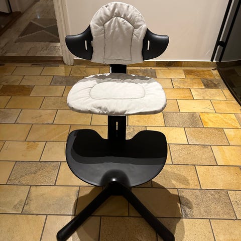 Stokke Nomi højstol med tilbehør: Babyindsats, bøjlesæt og tray. Vi har to stole som er helt ens.