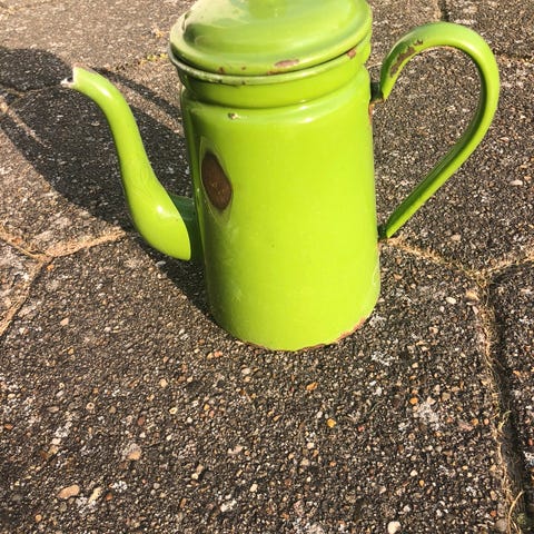 Kaffe kande med grøn emalje 22 cm høj, med brugsspor, men tæt. Kan bruges til vandkande, vase eller som dekoration i køkkenet eller sommerhuset.