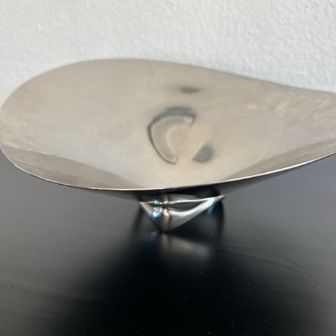 Georg Jensen Living skål fremstillet i rustfrit stål med en dekorativ og reflekterende overflade. Skålen har en rund form med en bred kant og står på en lille fod. Velegnet til servering eller som dekorativt element.
