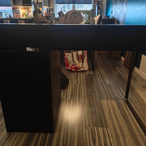 Lille skrivebord med ventileret skuffe/rum under bordet til pc/laptop.
