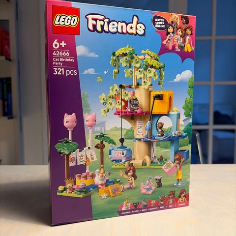LEGO Friends Cat Hotel byggeklodser. Sættet indeholder en model af et kattehotel med farverige detaljer og tilbehør, der inkluderer små figurer og møbler. Passer til børn og samlere, der interesserer sig for LEGO Friends temaet.