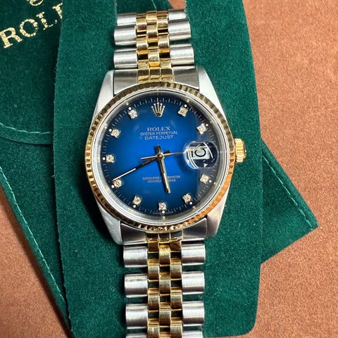 Sælger et yderst flot og eftertragtet Rolex Datejust 36mm med en flot og sporty blå skive på jubilee lænke: