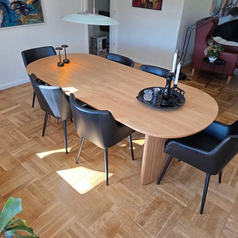 Ovalt spisebord I massivt hvidolieret egetræ, med udtræk til 2 plader.