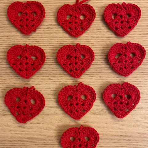 Søde små blomster, Håndhæklet i bomuldsgarn. Blomsterne måler ca. 3 cm i diameter.
