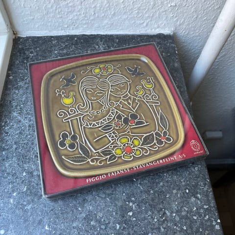 Stavanger Flint-design vægplade i trekantet form. Pladen er udført i glaseret keramik med flerfarvet dekoration af figur og blade på lys bund. Velegnet som vægdekoration eller serveringsplade. Stemplet på bagsiden med Stavanger Flint Norway.