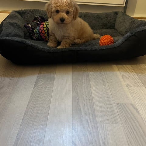 Sød og kærlig, hanhund på 3 et halvt år, søger nyt hjem. Dino er en yderst nem hund at have med at gøre, han kan være alene hjemme og elsker mennesker. Han er vant til togture og bil , og vant til at komme med ud på besøg og kan let blive passet osv. Han er vant til at blive børstet og klippet og vant til at have dækken på. Dino har ingen allergier og spiser alt, han er passet med alle vaciner og har pas. Han er ægte og har stamtavle. Og er både ansvars, sundheds og livsforsikret. Han er heller ikke bange for fyrværkeri eller torden. Alt i alt er han en yderst skøn og dejlig hund.
