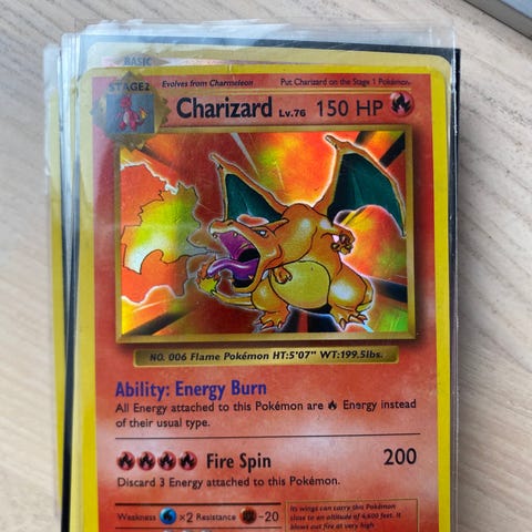 Charizard Pokémon kort med 150 HP. Kortet viser Charizard med angrebene 'Fire Spin' og 'Energy Burn'. Kortet er en del af Pokémon samlingen og har et illustrativt design.