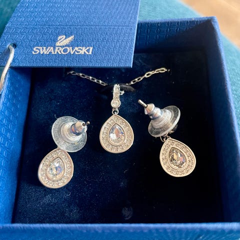 Swarovski smykke sæt til kvinder med krystal og perler. Sættet indeholder forskellige smykker med detaljer i krystal og perler, designet til at blive båret som tilbehør.