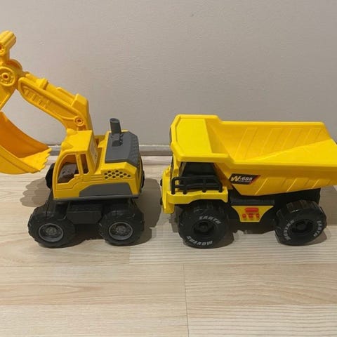 Sjov John Deere-gravemaskine fra Rolly Toys med 4 hjul. Den har en solid skovl og en stabil base. Skovlen betjenes med to håndtag og er perfekt til at grave i sand med.