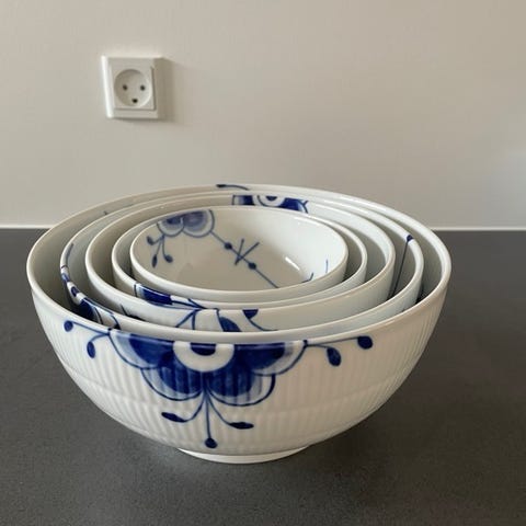 Royal Copenhagen Blå Mega skålesæt i porcelæn. Sættet indeholder fire skåle i forskellige størrelser med det karakteristiske blå mønster på hvid baggrund. Velegnet til servering af frugt, snacks eller som del af borddækning.